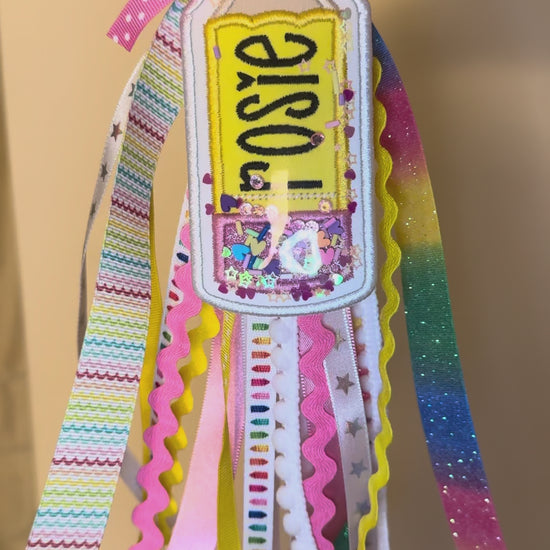 The embroidered pencil design has shaker confetti inside and is personalized with your name for a one-of-a-kind touch. It comes with colorful ribbon accents that are playful and glittery.